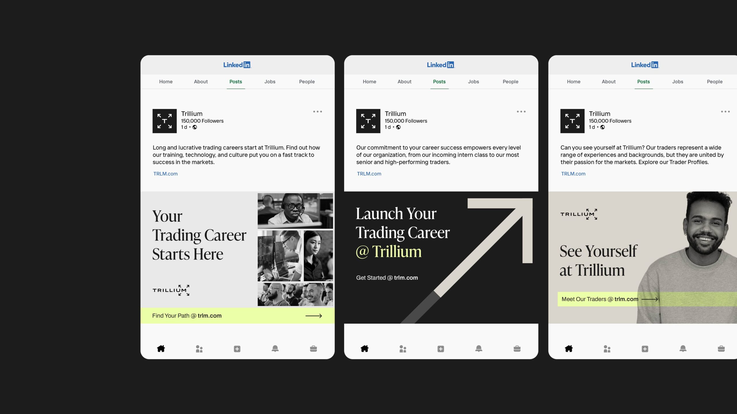 We delivered a modern, media-rich website combining copy, design, video and interactivity to bring the new brand to life. The copy reinforces Trillium’s core messages, with a “The Path” page mapping the progression from internship to lead trader and a “The Traders” section featuring interviews and visuals that showcase real faces and stories. The site encourages prospective talent to imagine themselves building their career at the firm. Once the website was live, we worked with Trillium to define a modern social media strategy.